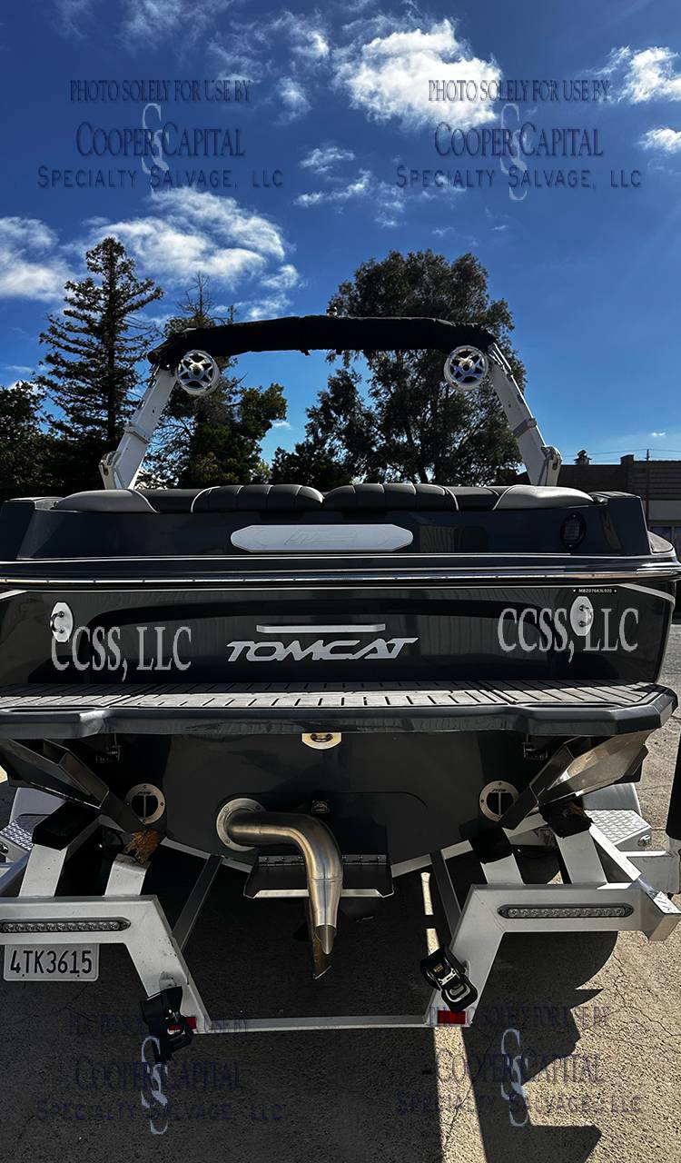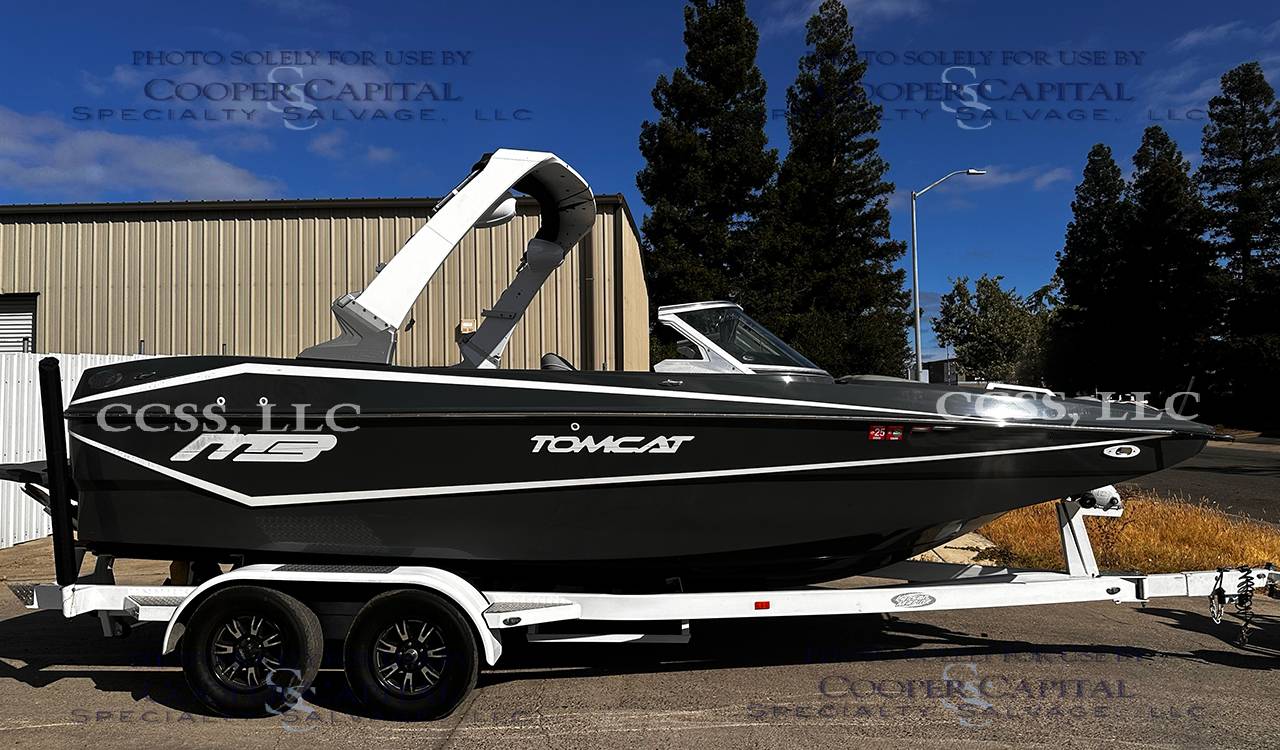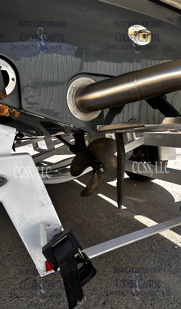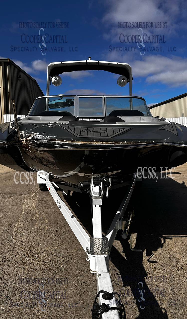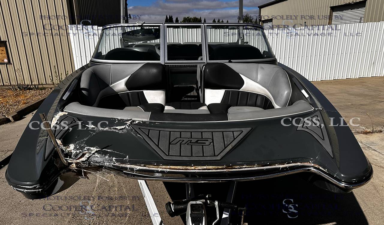 Vessel and trailer were being towed when the truck pulling them was struck by another vehicle. There is damage throughout the starboard side bow. The engine is reported to run, please see videos.