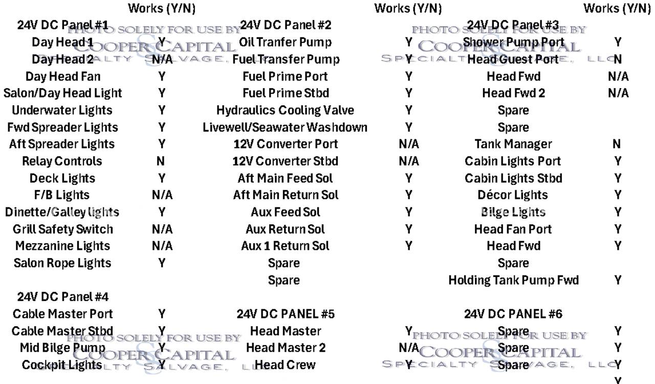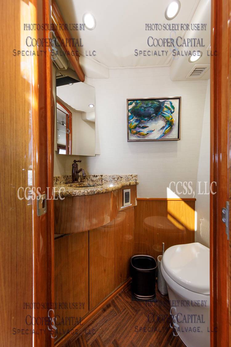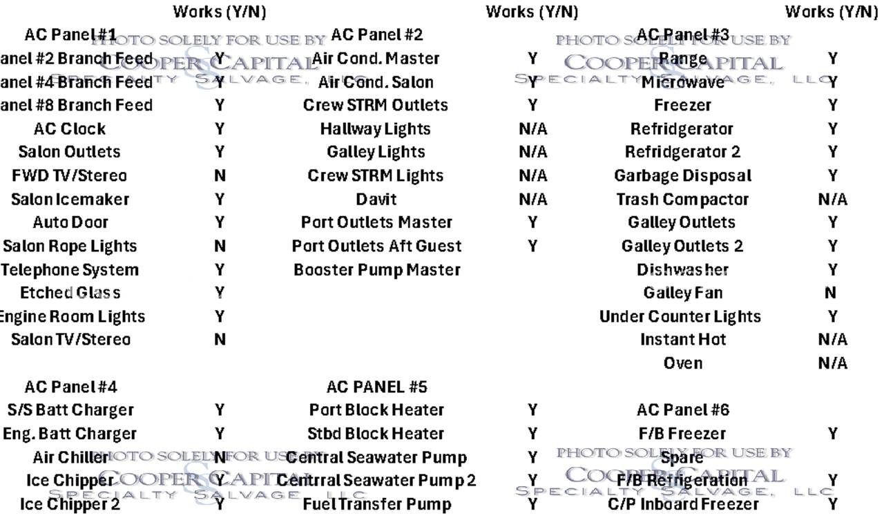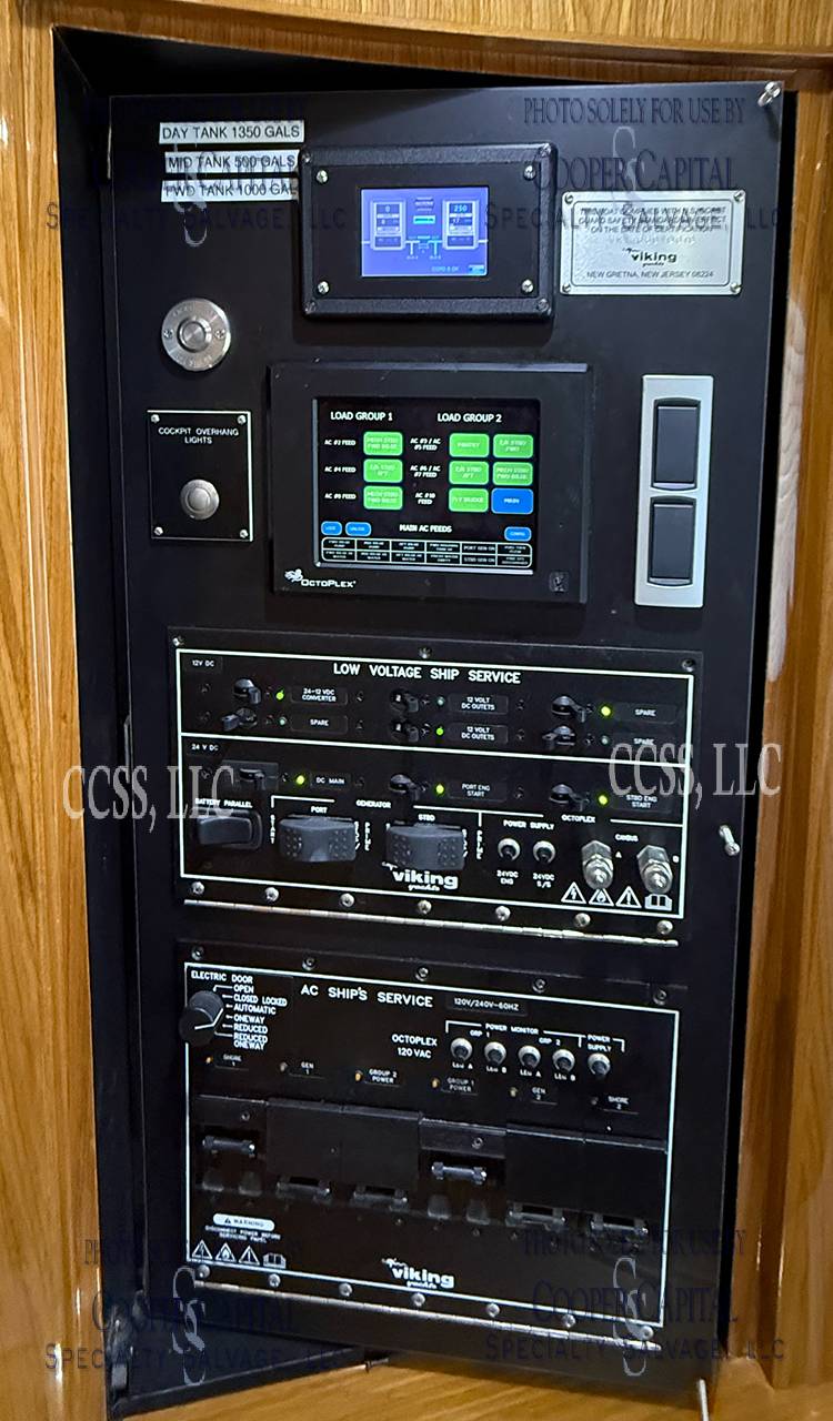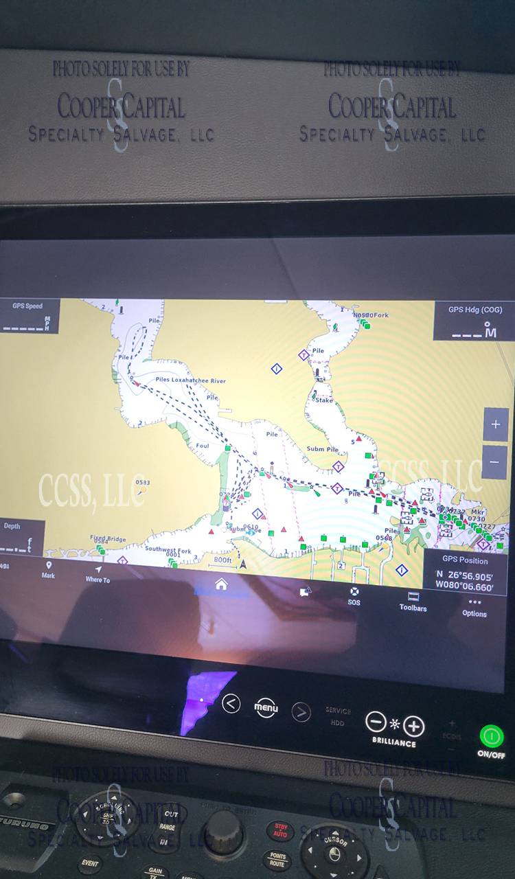 Vessel was struck by lightning and a negotiated settlement was reached with the owner as a result of the length of time it would take to repair the vessel. In the meantime, CCSS, LLC has been able to repair many of the systems affected by the lightning strike. About 75% of the systems prove operable and some parts are on order to prove more. Please see photos and videos of most of the systems that are operable. The octoplex system is currently being repaired should be almost completely operable in the coming weeks. Parts were ordered for the seakeeper and will arrive about the same time as octoplex. Please see video of the engines running.Please call Ron at 860-227-3803 to make appointment to view vessel. Boat is in Palm Beach area. INSPECTIONS WILL NOT BE PERMITTED WITHOUT APPOINTMENT. Updated Electronics Suite New paint New cushions All new ultra-leather in salon and bridge Interior bright work (many panels redone)