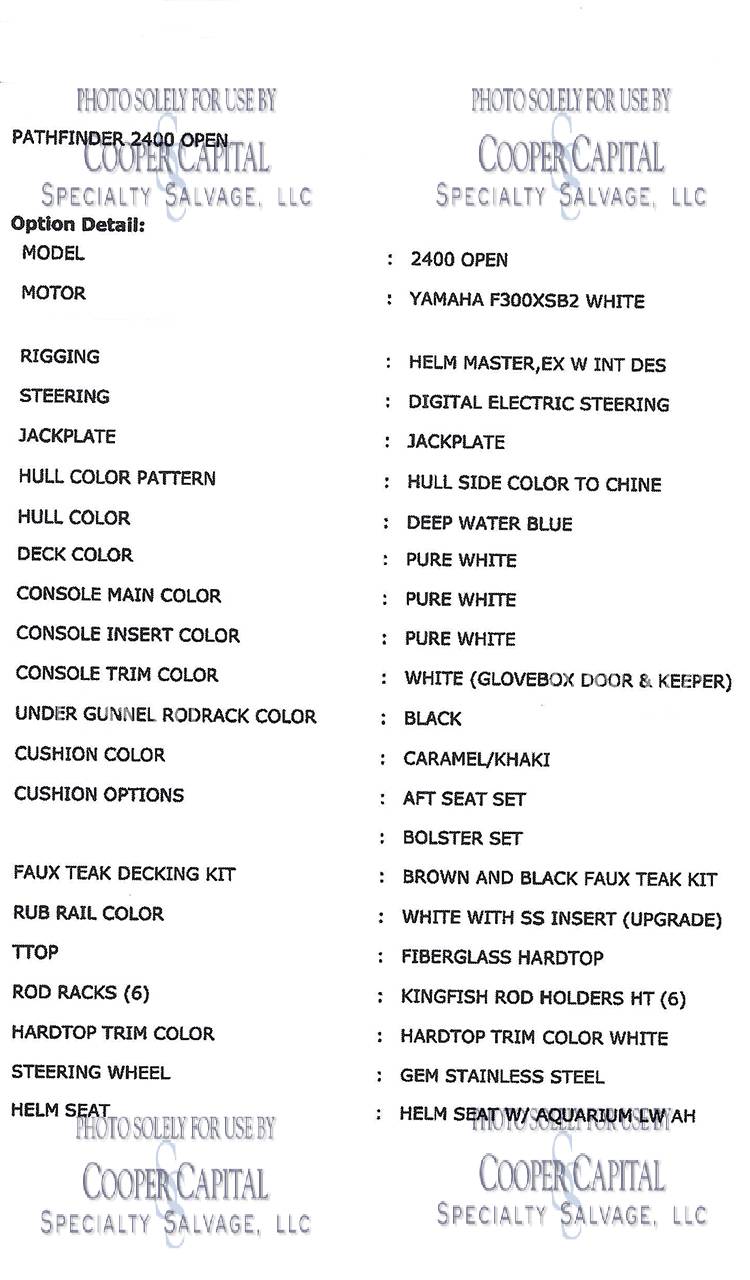 All Sales Final, No Refund Policy. This "All Sales Final, No Refund" policy applies to all boat auctions conducted by Cooper Capital Specialty Salvage,LLC through our website or any other platform where our auctions are hosted. All sales of boats through our auctions are considered final once a winning bid has been placed and the purchase is completed. By participating in our auctions and placing bids, you acknowledge and agree that you are entering into a binding contract to purchase the boat in question.