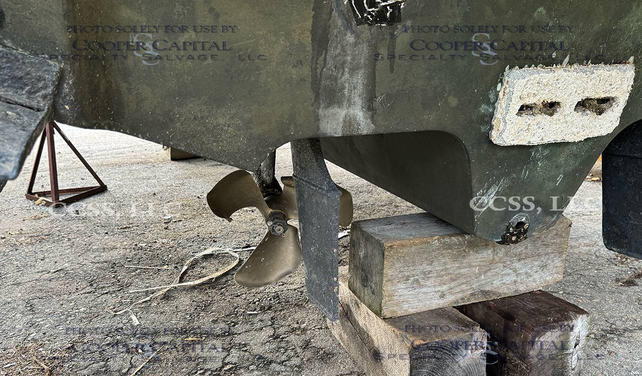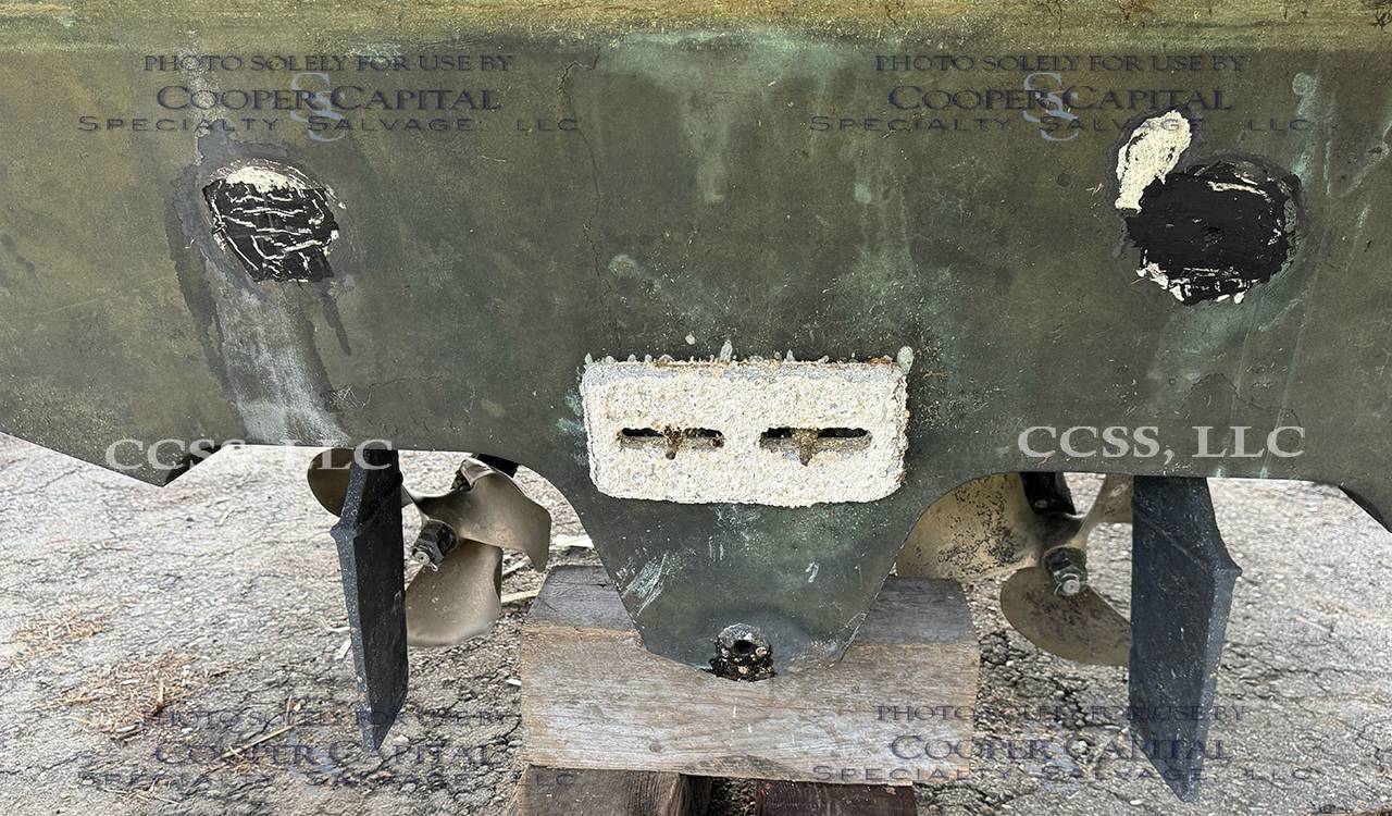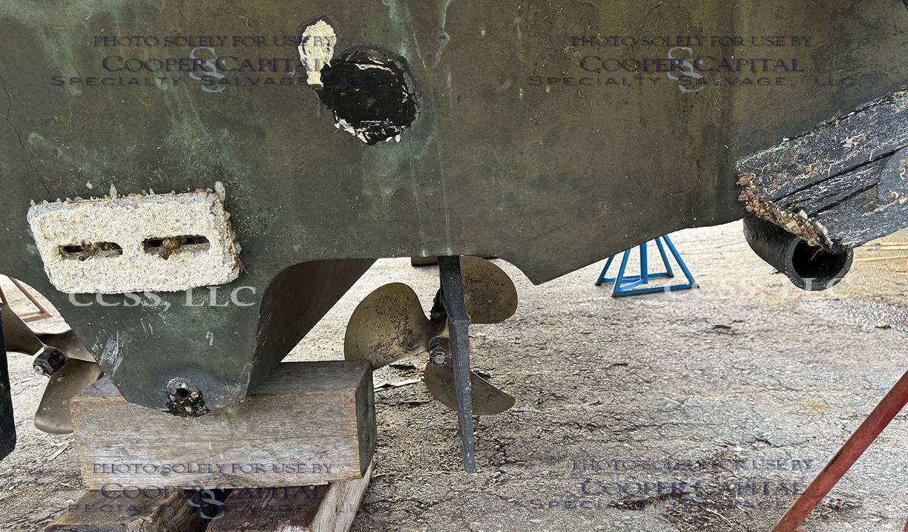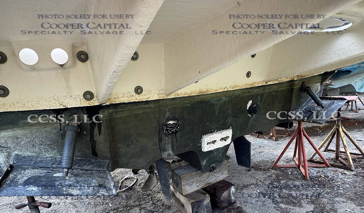 This vessel hit a submerged object. It does not appear to have any water intrusion. There are scrapes and gauges on the bottom of the boat. There is damage to the Portside propeller. The engines start and run. The generator turnover but does not start.
