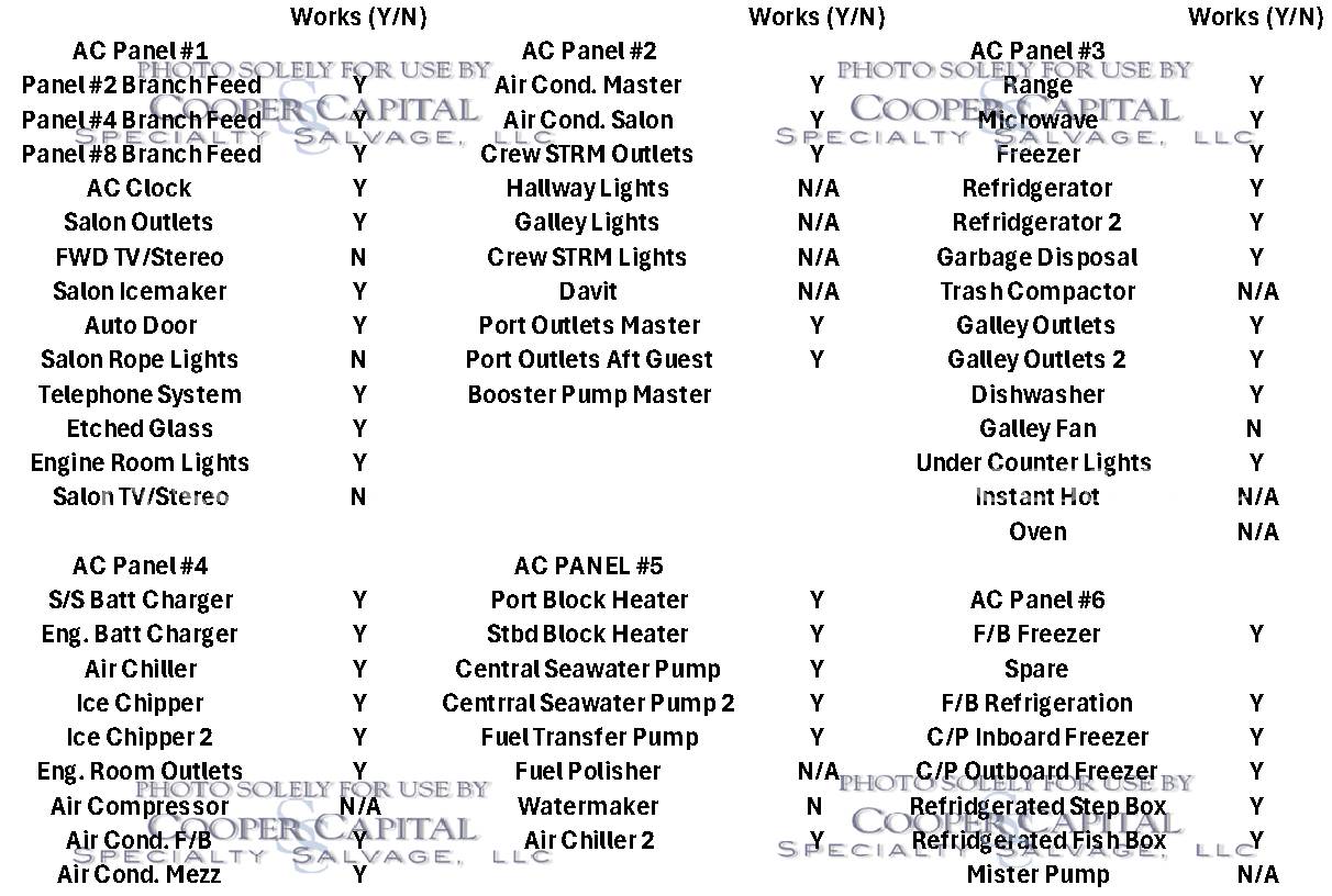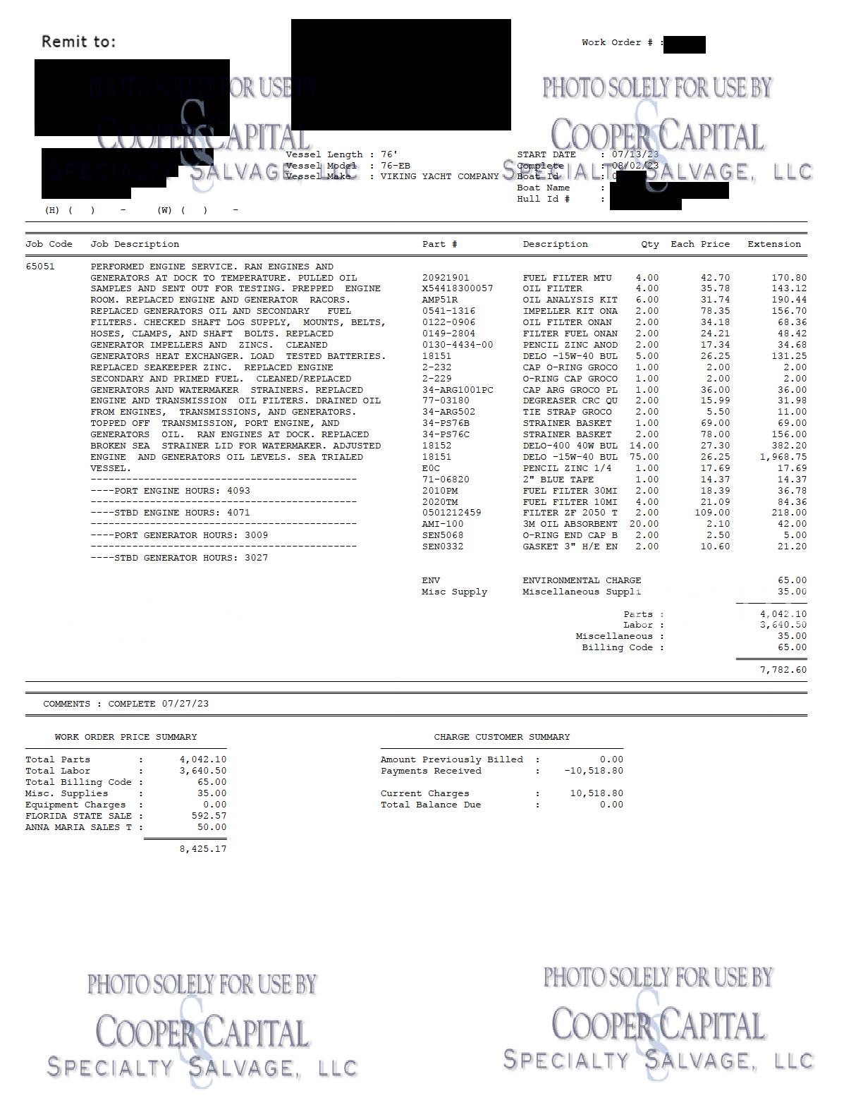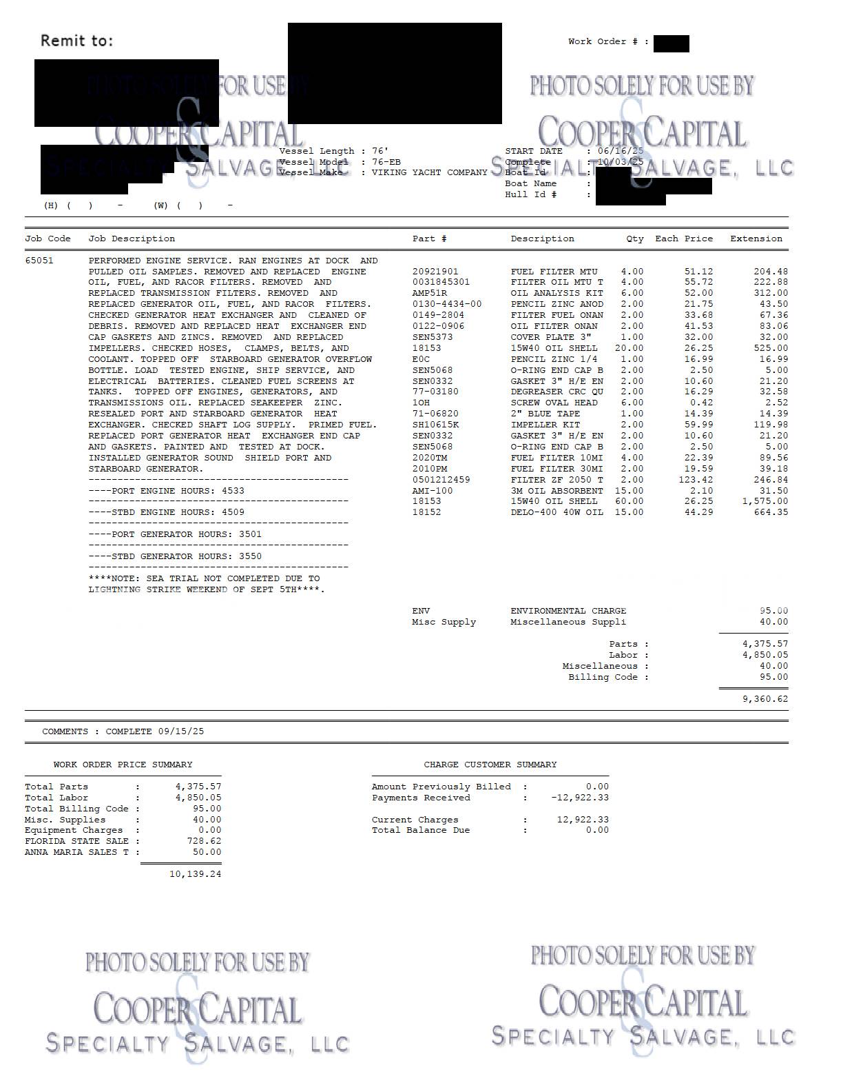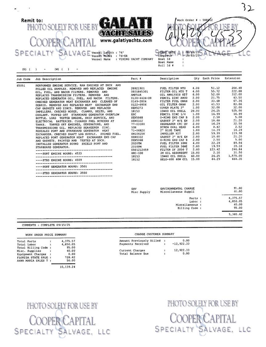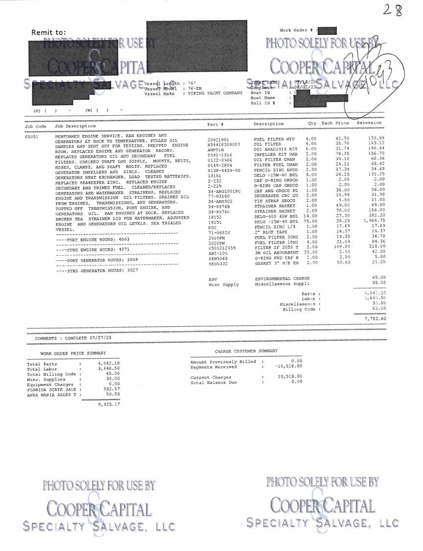 Please scroll down to see videos of vessel running. 4000 HOUR SERVICE PERFORMED, please click previous listing link for verification ( https://www.nestseekers.com/yacht/10356/mm-cricket-76-viking-76-enclosed-bridge-2010-florida-usa ). We have receipts for engine maintenance which will be on boat. Boat was very well cared for. Vessel is being worked on daily, please call CCSS, LLC for updates. Oil samples have been uploaded, please see photos section. Vessel was struck by lightning and a negotiated settlement was reached with the owner as a result of the length of time it would take to repair the vessel. In the meantime, CCSS, LLC has been able to repair many of the systems affected by the lightning strike. About 90% of the systems prove operable and some parts are on order to prove more. Please see photos and videos of most of the systems that are operable. The octoplex system is currently being repaired should be almost completely operable in the coming weeks. Octoplex system replaced as well as Foruno black boxes for bridge displays. Please see videos below. Call for updates. All chillers descaled and boards replaced and will be running this week. .Please call Ron at 860-227-3803 to make appointment to view vessel. Boat is in Palm Beach area. INSPECTIONS WILL NOT BE PERMITTED WITHOUT APPOINTMENT. KLNA Airport is 5 minutes from the boat. Updated Electronics Suite | New paint | New cushions | All new ultra-leather in salon and bridge | Interior bright work (many panels redone) | New topside and superstructure Paint in 2021 | All New Electronics in 2020 | Fresh Bottom Paint and Propspeed March of 2022 | 4000 Hour Major MTU Engine Service Performed including Complete Fuel Injector Update | Seakeeper serviced March 2022 | Teak Deck New in 2015 CURRENT PARTS THAT HAVE BEEN ORDERED BUT NOT INSTALLED: *Remaining Light Links * Micro Female connectors for AC/DC boxes * (3) Battery Monitors * Viper steering Display * Encoders * DC CAN BOARDS * REPLACE 100A BREAKER FOR SHORE POWER 2 **LABOR & INSTALLATION IS PAID FOR & INCLUDED WITH THE PARTS**