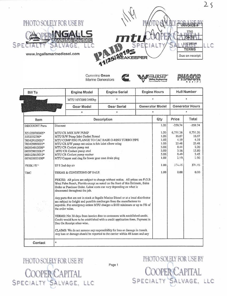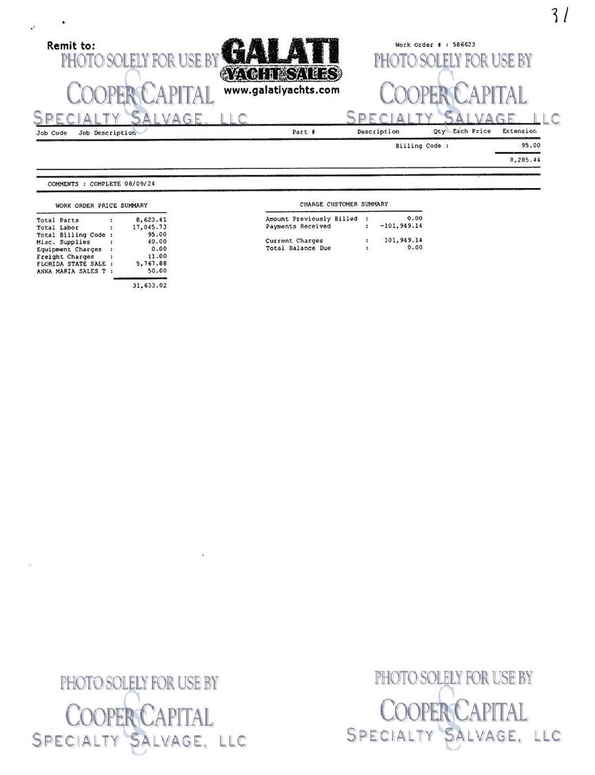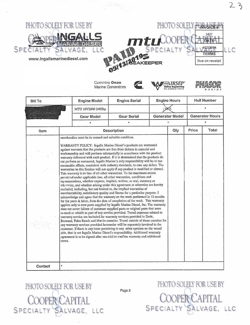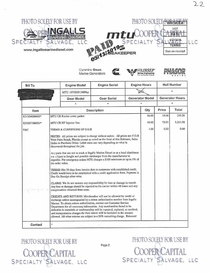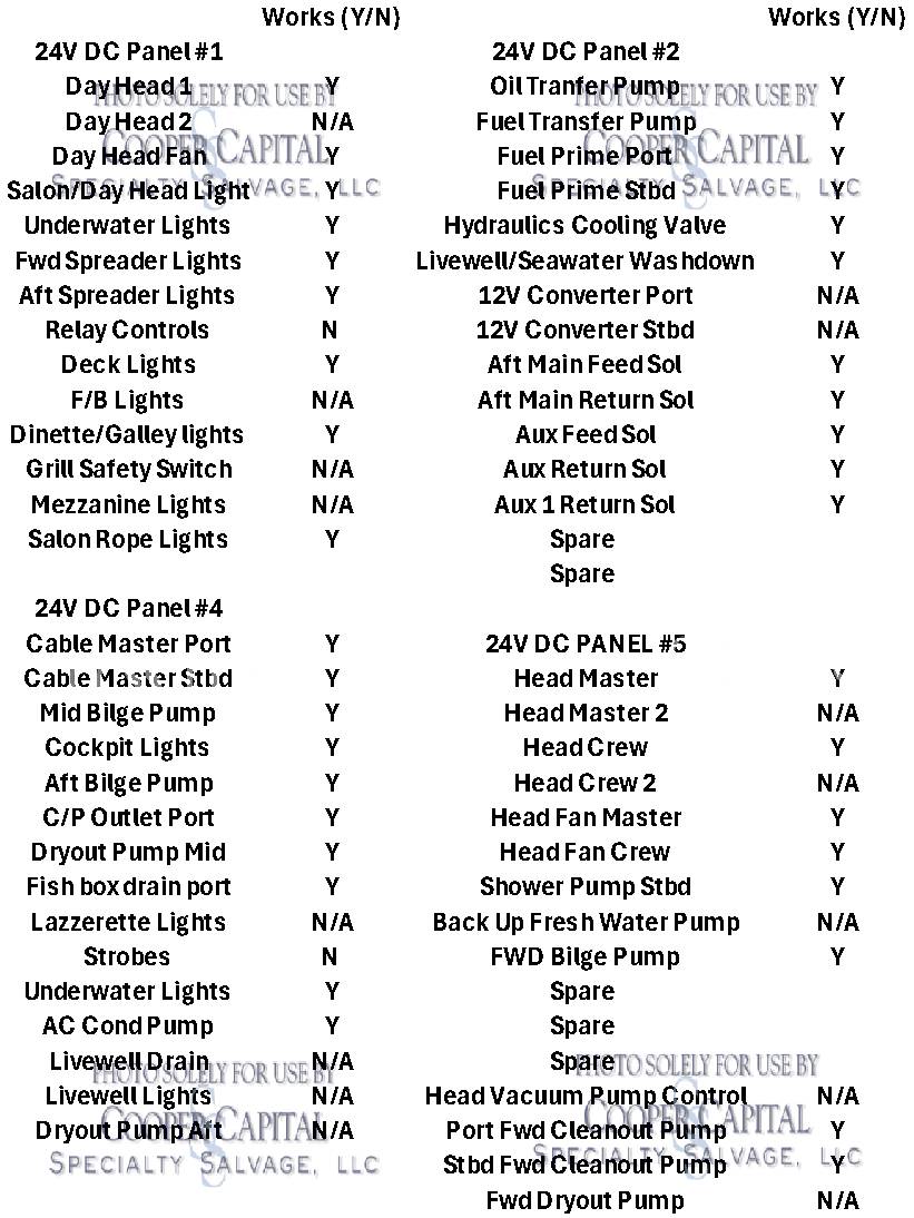 Please scroll down to see videos of vessel running. 4000 HOUR SERVICE PERFORMED, please click previous listing link for verification ( https://www.nestseekers.com/yacht/10356/mm-cricket-76-viking-76-enclosed-bridge-2010-florida-usa ). We have receipts for engine maintenance which will be on boat. Boat was very well cared for. Vessel is being worked on daily, please call CCSS, LLC for updates. Oil samples have been uploaded, please see photos section. Vessel was struck by lightning and a negotiated settlement was reached with the owner as a result of the length of time it would take to repair the vessel. In the meantime, CCSS, LLC has been able to repair many of the systems affected by the lightning strike. About 90% of the systems prove operable and some parts are on order to prove more. Please see photos and videos of most of the systems that are operable. The octoplex system is currently being repaired should be almost completely operable in the coming weeks. Octoplex system replaced as well as Foruno black boxes for bridge displays. Please see videos below. Call for updates. All chillers descaled and boards replaced and will be running this week. .Please call Ron at 860-227-3803 to make appointment to view vessel. Boat is in Palm Beach area. INSPECTIONS WILL NOT BE PERMITTED WITHOUT APPOINTMENT. KLNA Airport is 5 minutes from the boat. Updated Electronics Suite | New paint | New cushions | All new ultra-leather in salon and bridge | Interior bright work (many panels redone) | New topside and superstructure Paint in 2021 | All New Electronics in 2020 | Fresh Bottom Paint and Propspeed March of 2022 | 4000 Hour Major MTU Engine Service Performed including Complete Fuel Injector Update | Seakeeper serviced March 2022 | Teak Deck New in 2015 CURRENT PARTS THAT HAVE BEEN ORDERED BUT NOT INSTALLED: *Remaining Light Links * Micro Female connectors for AC/DC boxes * (3) Battery Monitors * Viper steering Display * Encoders * DC CAN BOARDS * REPLACE 100A BREAKER FOR SHORE POWER 2 **LABOR & INSTALLATION IS PAID FOR & INCLUDED WITH THE PARTS**