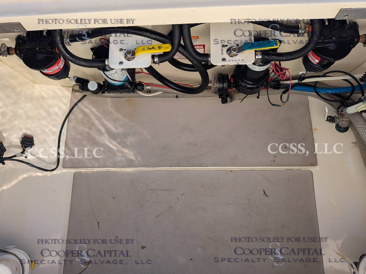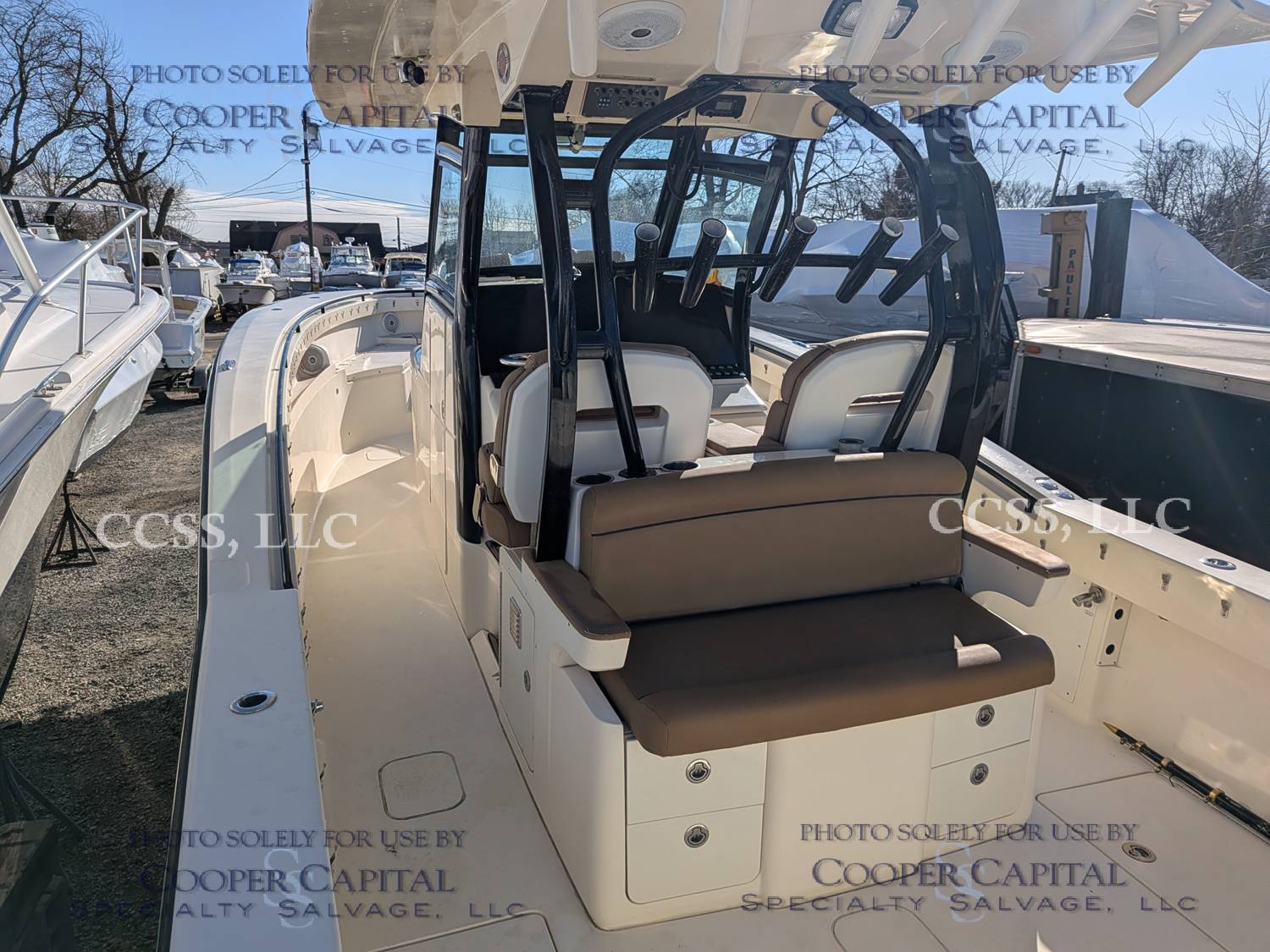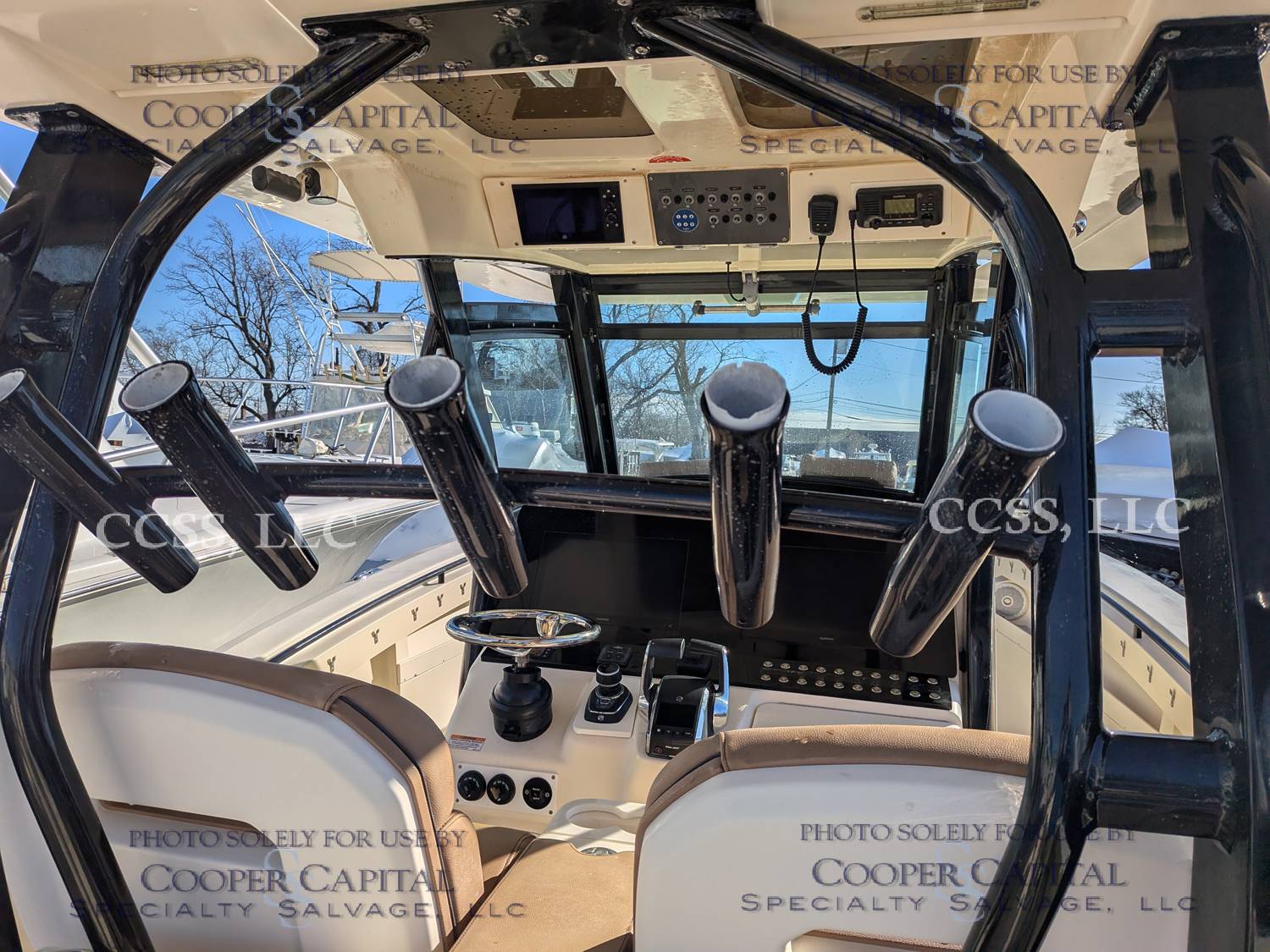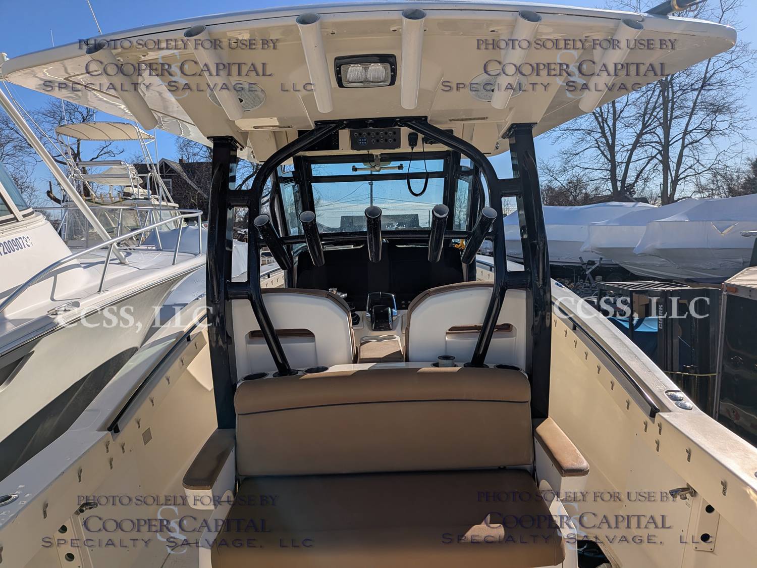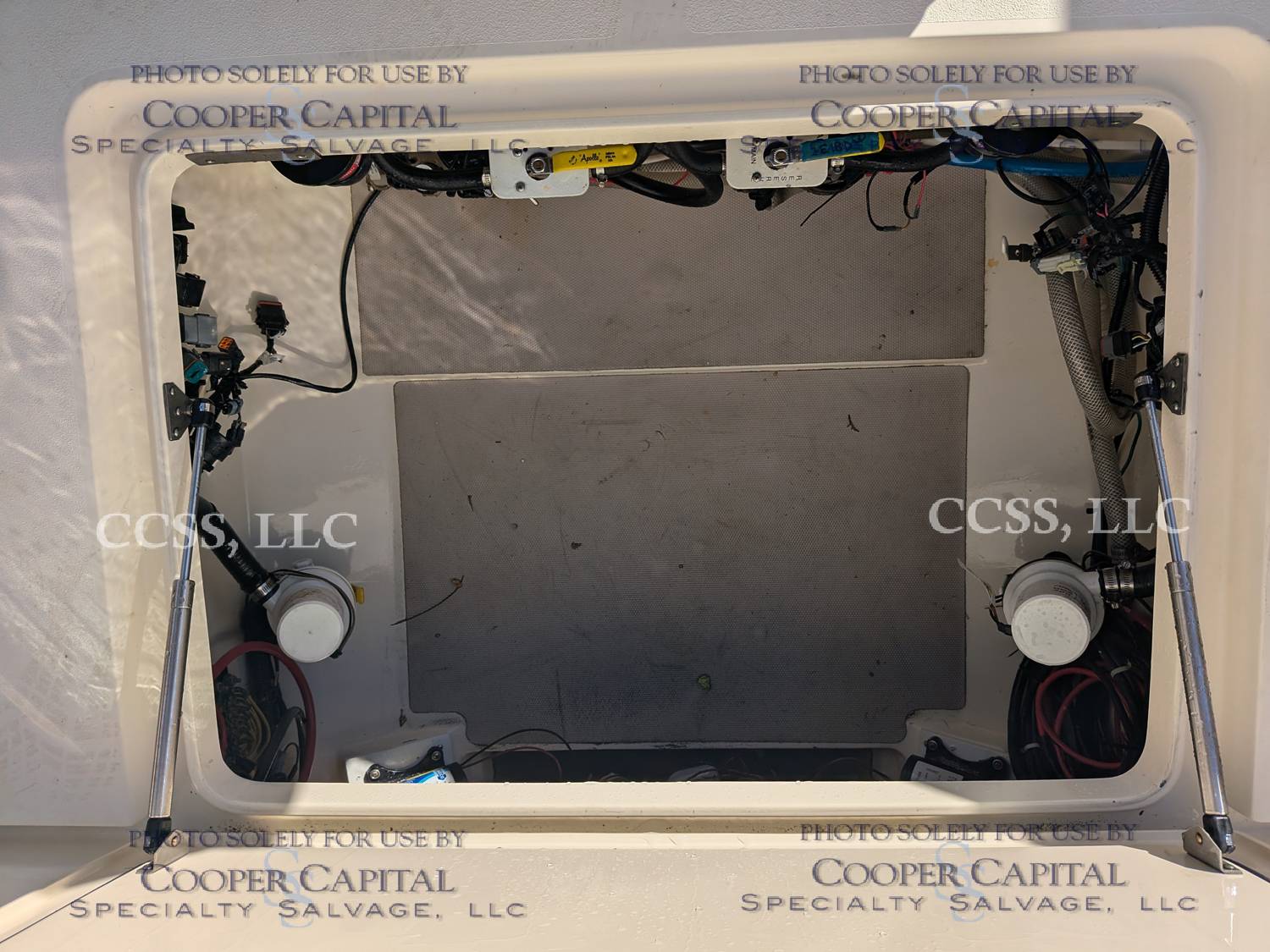 Vessel submerged damaging the engines and electronics. Engines were pickled. Both are reported to turn over. Please scroll down to see videos. There is fiberglass damage to the T-top.